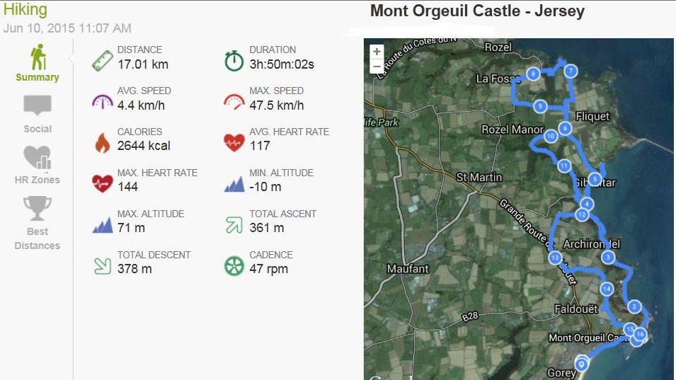 Van St. Helier reed ik naar Mont Orgeuil Castle. Daar gingen de wandelschoenen aan voor de eerste wandeling van deze vakantie. Volgens mijn beschrijving zou het een wandeling van drie uur zijn maar dat leek me een beetje optimistisch ingeschat. Het was wel een heel mooie wandeling met veel variatie : kust, bos, bergop, bergaf (gelukkig maar).