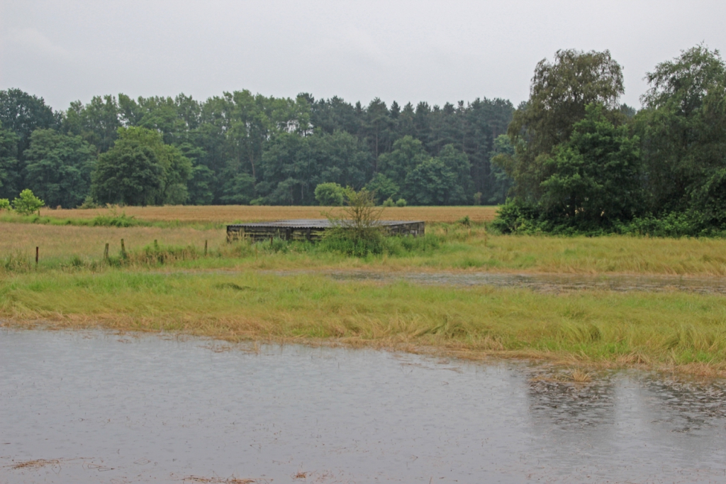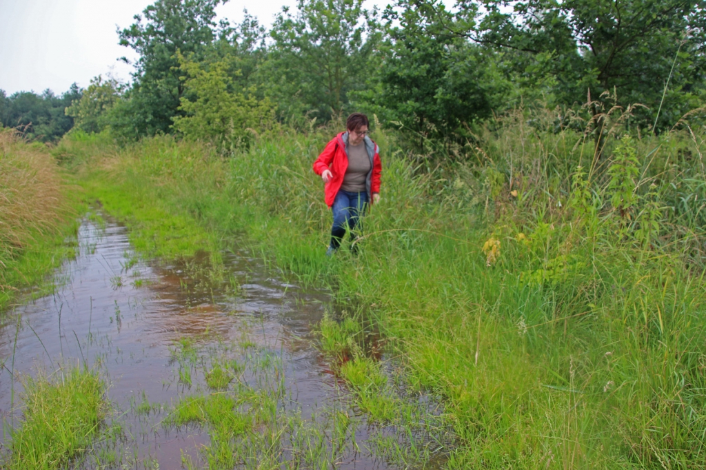 Toen we na een vijftal kilometer de Nete verlieten en meer “inlands” gingen ontdekten we pas echt wat “nat worden” betekent. Op sommige plekken stond het water tot aan de enkels maar op de meeste plekken stond het gewoon tot aan de knie. En al heb je dan waterdichte schoenen aan … je broek en het stuk van de kousen dat niet in je schoen steekt wordt gewoon kletsnat. Gelukkig was het niet koud en dan kan je het grappige er wel van in zien.