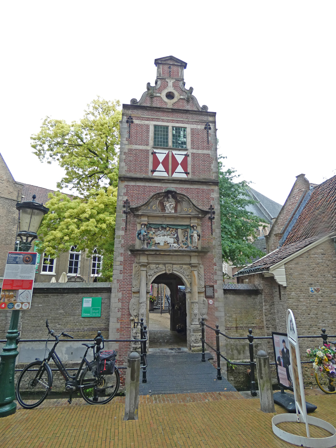 Zoals wel vaker gaan we in een stad op zoek naar de Toeristische Dienst oftewel de VVV. Daar kochten we de gids voor de stadswandeling “Op pad in Historisch Gouda”, een 3,5 km lange wandeling die werd uitgestippeld en beschreven door het Goudse Gidsen Gilde. De stadsgidsen beschrijven er hun favoriete plekjes in Gouda.