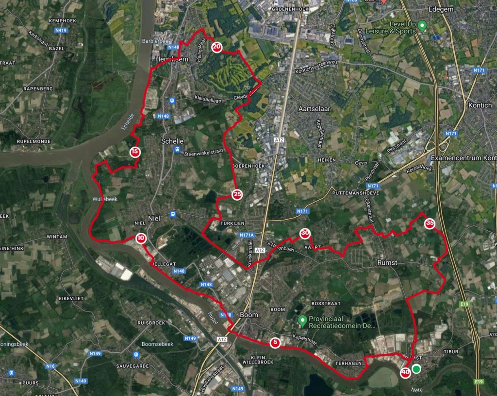 Je passeert Terhagen, Boom, Hellegat en Niel om dan via de Schelde Hemiksem te bereiken. Onderweg zie je uiteraard veel water maar ook de teloorgegane industrie van onder andere Noevere.